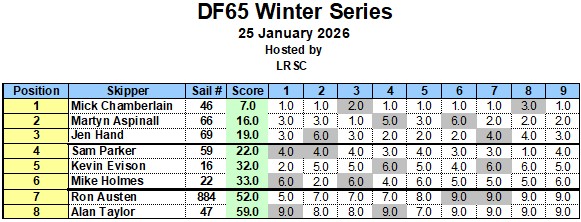 Your duty crew for the day Sam (OOD) and Ron (ARO) were down at Scotland Farm to set-up just as it was getting fully light, racing for the day was to be on the South Bank with a simple beat/run course. Many thanks to Ron for getting involved even moving marks around, I reckon we’ve got a budding OOD there. Just for a change it was raining, but as preparations were about complete the rain abated and stayed away for the remainder of the day. With eight eager competitors racing was soon underway, however with LRSC being a helpful kind of venue Jen Hand missed the first race having helped new member Alan get his boat to the start line, average results have been given for this race. The first race was won by Mick C (46), this set the tone for the rest of the day with Mick taking all of the wins apart from two races which were shared out between Martin A (66) and Sam P (59), We completed the first four races of the day before a coffee break, during which many sailors again gave time to help tune and fettle boats that had issues during the previous session. However, as we again hit the water for the second set of racing the attrition rate was quite high with two boats experiencing race ending issues, but with both parties taking away the knowledge and advice to come back faster next time out. With nine races completed and the results calculated it was Mick C (46) who led the way with some great results and a clear points lead on the day. With racing completed for the day, it was all hands-on deck to help your duty crew pack away the equipment, for which many thanks are given.