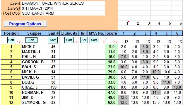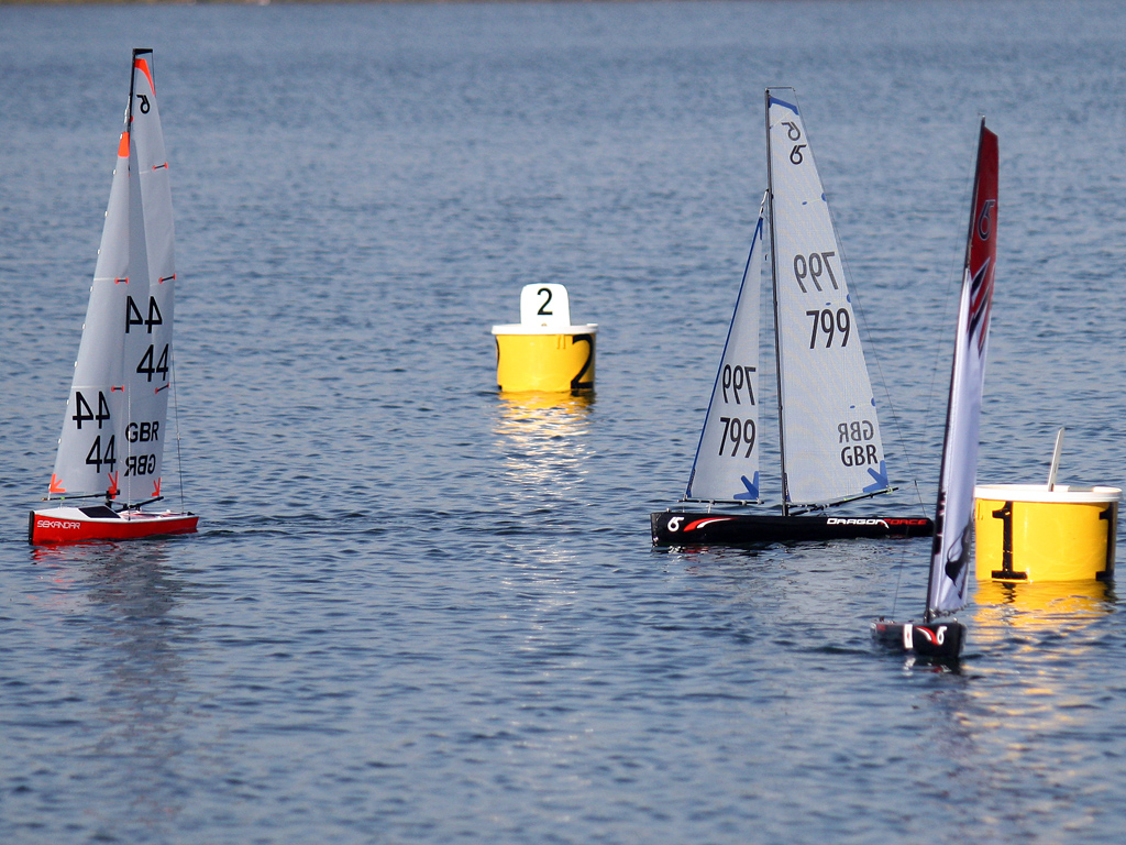 Another fantastic day at Scotland Farm , The weather and sunshine meant that coats came off and a light south-westerly breeze had all boats with their top suit on. This was the first full morning for the Dragons , and twelve competitors came to the line for the first of six races, each lasting approx 20 minutes with two laps of the windward / leeward course, the beat was true but tricky and you had to pick the right side to make gains, all buoys were port rounding and it looked liked Martin 31 was straight into winning ways with a first win, Mick .C 46 got a second, and Gordon. b 23 followed up with a third place, Gordon has made all his own sails, and very nice they looked too, so I am sure there will be some orders in the pipeline!!!!! The racing proved one thing though, it didn’t really matter on sail choice as the sails that come in the box with the Dragons are equally competitive with any others, the boat also seems to be a great leveler and providing you get your trim about right the boats are easy to sail, all you need do is point them in the right direction. The racing was very competitive and there were 4 different winners in the first 4 races ,Mick.H 14 getting a second in race 3 must be very pleased with his progress and a little tweak here and there could have Mick on the podium more often, Seymore. G who borrowed the club boat for one of the races seemed to enjoy himself, although he only did the one race , The club boat is there for anybody who wants to have a go so just see Martin at Lakeside. results are posted below and I will get the Winter series results up in the next day or two. I am sure all the members will give a warm welcome to our two new members Phil and Jim , both have I.O.M and Dragons, and we look forward to racing with them in the weeks to come, If either of you need any help or assistance you only have to ask.