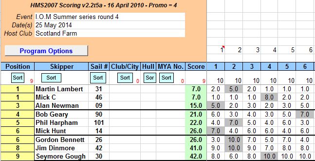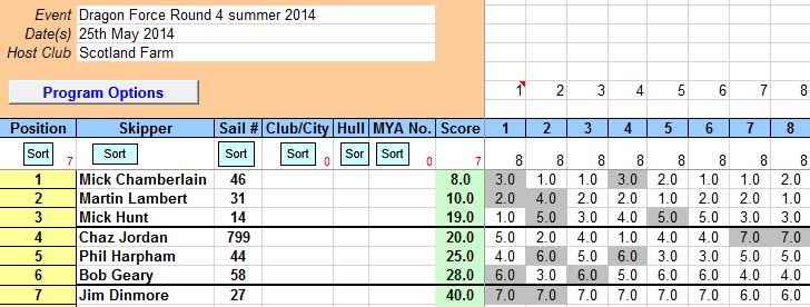 7 Dragons came to the line , the course was a little shorter but just as shifty with a top suit breeze , Th first race was won by Mick H after a fantastic start which did prove when you get a good start and clear air you can sail your own race Martin got the second and Mick C third , Race two saw Chaz get into gear with a great second place and Bob G a pleasing third , All the races were great to watch with close racing , and in Race four Chaz dominated and just crossed ahead of the chasing Martin, Consistency is the key in racing, and also possibly being conservative as well especially on the first leg of the course, try to stick with the leaders and then on the final beat make your move and put pressure on.. 8 races were held in pretty warm conditions and all those who laughed at Bob in the morning cos he had his shorts on, were looking at him in envy during the afternoon with temperatures up to 20C at least. results are below , so study them to try to remember what you did right or wrong ,,, round five comes up soon and it is all to play for .