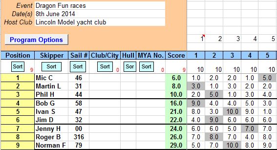 After the I.O.M races we had a cuppa and the 9 competitors brought their Dragons to line on a slightly shorter course and five fun races were sailed the competitive nature was evident and some great scraps ensued , Both Jenny H and Roger B put their boats on the water for the first time, and I am sure enjoyed every minute of it . It was good practice in readiness for next weeks round which counts for the summer series ., There is a club boat but if you want to borrow for the races get you name in to Martin quick. Results below.