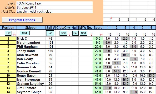 A fantastic sun filled day with a super 10/12 knot breeze from the south east greeted 14 competitors who came to the line. A windward leeward course of two laps was set after the briefing which included a short talk on the rules and behaviour that was to be expected in the control area. This set the tone of the racing throughout the morning and behaviour was exemplary with rules being obeyed and turns being completed. Mick C 46 with his Britpop was determined from the outset to put some good scores on the board and in the first race secured the victory from a fine performance from Alan Newman 09 2nd place and Phil Harpham 101 coming home in third with his Stealth and brand new RMG sail winch. Bob Geary gaining a fourth and is counting down the days when his new Evo 3 hits the water . Race two again saw Mick C dominate but Martin L 131 came back strongly to get the second place and Phil again getting a third spot with some consistent sailing. Race three saw an end to the dominance with Martin posting a win with Mick in second and a brilliant performance gave Jenny H 169 third spot. The races continued with every race nip and tuck and it was pleasing to see everybody racing well and making some good tactical decisions on a tricky windward leg. This set of races has been the best we have had so far at Scotland Farm and a great attendance. Individuals can check out there results race by race below and will have an idea why they went well or not so well, and it should give some clear pointers at what needs to be done to improve for round six.