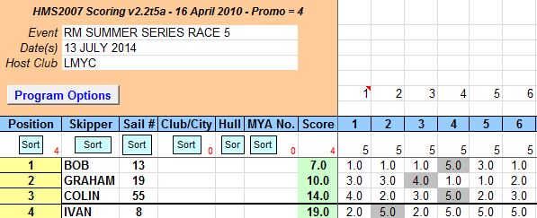 Only 4 RMs turned out on what proved to be a testing day. It started light and variable but dry and warm. By race 4 we had heavy squalls with driving rain. Most of the skippers were caught out as proved by the fact that only half the fleet finished. Racing ended in showery conditions with a fresh breeze. The fleet was augmented by 6 IOMs and 5 Dragons had some fun to finish off.