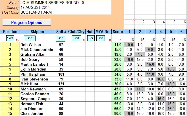A breezy blustery day greeted 15 competitors at Scotland farm for round 10 of the I.O.M summer series, We welcomed a new member and a repeat visitor to the club on what was to be a good blow with B suits all round. The rain held off but we had a brief two-minute shower about mid morning and then the sun came out to stay . Proceedings were slightly delayed as the wind changed direction just prior to the start and a new course had to be set along the south bank and we eventually started at 10 15 am .Race one was won by Mick Chamberlain GBR46, but it was by no means easy on the windward leeward course with places changing on a regular basis. Martin Lambert having completed the sale of his Lintel and having to sail an old but perfectly formed Gadget GBR 14 was finding things a little more difficult , especially as this was Lintel weather , The other Lintel in the fleet Chaz Jordan’s GBR 99 had yet another early bath going home before the first race was completed. Graham Allen sailing his new Chienz was performing well as was Bob Geary s new EVO 3 GBR 58 , but none as well as Robert Wilson Fraktal GBR 97 designed by Graham Bantock who went on to dominate the next 4 races leaving all in his wake. The racing was exciting, with battles throughout the fleet taking place, making for some very fast and furious racing , The results are posted below , but I would just like to give my thanks to Martin for having a teach in on rigging and first beat strategy including starting as soon as racing had finished , there will be more of this in the future because we find that the level of sailing has improved this year , which is good for the individual and for the club.