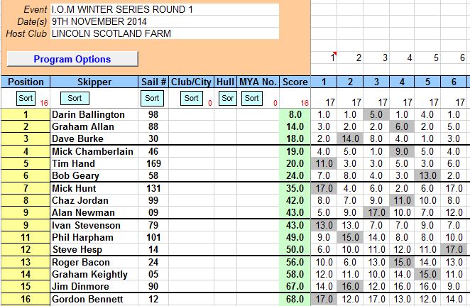 A fine sunny day greeted 16 competitors for the first round of the winter series for I.O.M , The only guy who didn’t turn up was the wind, Racing was started on the south bank after a two minute silence for remembrance day. The club welcomed two visitors Darin and Dave and race one drifted off the line heading for the weather mark , Darin showed his skill in light airs closely followed by Dave 30 and Graham 88, Tim sailing his Mums Robot 169 was showing some fine form early on getting a couple of third places, Tim only recently making the transition from Dingy s. After race three a coffee break was called and Mick C changed the course so we could sail from the East bank with a half decent windward leeward course , two laps were required but at least the boats were moving, and the last couple of races there was more than just a faint zephyr to help the yachts along . Racing finished at a slightly later time at 1250 . Looking through the scores many of you will study where you actually went wrong as the points were very close all through the fleet. Congratulations to Darin , But three club members I think will be well pleased with there performance apart from Graham who got a second were Tim 169 Mick 131 and Bob 58 , Alan had a rudder failure in one race which just goes to prove you cannot afford anything to go wrong,in your series on a Sunday Morning result are below , but we look forward to the next round which is round 2 on the 30th November .