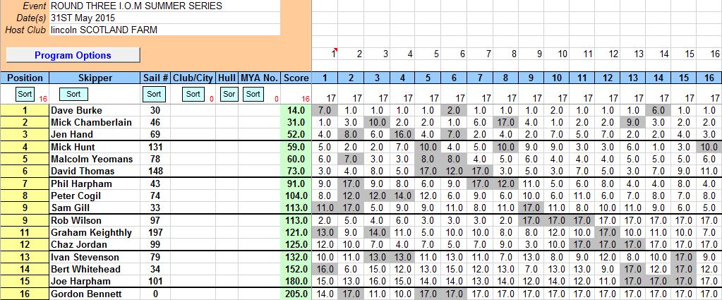 Yet another fantastic day at Scotland farm 16 entries and 16 races sailed , Weather conditions started with a little rain , and top suit but by race three the breeze had picked up to a steady B suit breeze. The club welcomed four visitors from the Rotherham club, Sam, David, Peter and Malcolm. After a slow start from Dave Burke he quickly got into his rhythm with 4 straight wins closely followed by a Mick Hunt posting some good early results, Jen Hand again started slow but gradually found her form with some cracking results towards the end of the Day,as did Phil Harpham , who is now reaping the rewards of such hard work Building his own Goth,, consistancy is of course what we all strive for and Malcom Yeomans from the Rotherahm club put some pretty close scores together after Lunch, to give him the bragging rights for the visitors. With 16 races , it is a pretty long day for most people and we certainly walked the banks today, it all became to much for Chaz who had a lay down midway through the afternoon and poor of Jo had a touch of hayfever , I think Rob was under orders not to be late home , I must admit I was flagging at the end, but the day turned out nice and sunny and very windy. I am sure everybody enjoyed them selves and had some great racing where ever they were in the fleet. Results are posted below.