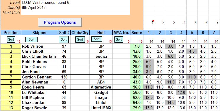 Lovely start to the day 13 skippers , not to cold, the odd drop of rain, not much breeze 3/4 knots max. The weather marks were a bit of an eye sight test for some, with most failing at some stage in the morning. Nice to report no salad , Rob and Bill got things underway prompt, and Chris E was soon into his light weather trim to take the first race, closely followed by Rob W and this was to be the battle royal for most of the morning with the two B/P’s sailing really well. Mick C with the Sedici never really got a look in, and I have to say it was pretty consistant sailing for most of the skippers.