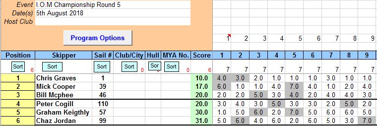 Sunday the 5th dawned at LRYC warm, overcast and virtually no wind..!!!….but as is often the way at Scotland Farm, by the time the attending IOM skippers (6 this time) had prepared their racing machines and the officers of the day, Chaz and Mick had chosen a suitable and long 1 circuit course almost the full length of the east bank, the wind was picking up, well, a slight breeze would be more accurate for race one but as the morning progressed the wind strengthened a little for each of the 9 starts and some great racing was had. After three races the course was doubled as our officers decided the IOM skippers weren’t walking far enough……..!!!