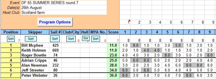 Sorry everybody just trying to catch up this is the results of the DF 65 round 7 race on the 26th August great result from Bill Mc who takes it on countback, it was a bad weather weekend so lets hope the next round has a better following
