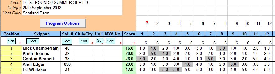 6 Skippers in the DF 95 fleet had some great hard fought racing in fantastic conditions , sun, breeze, and good humour. Mick C took the podium with five wins from twelve races.