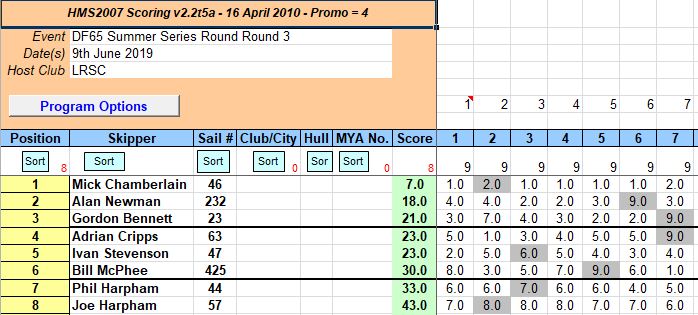 A great morning at Scotland farm for round three of the DF 65 series , Only 8 skippers for this one , but the weather was great and a light South Westerly around 7/8 knots gave a good beat and run course. Rig of the day was A + but the were a couple of C.B.A so they were on A rig and if the breeze had just been a few knots more they could have come into there own. Mick C fresh from the DF 65 Nationals was quick of the mark with a bullitt in the first race closely shadowed by Ivan, Adrian took the second race, with Mick C just gaining twpo places with yards to go to get 2nd.