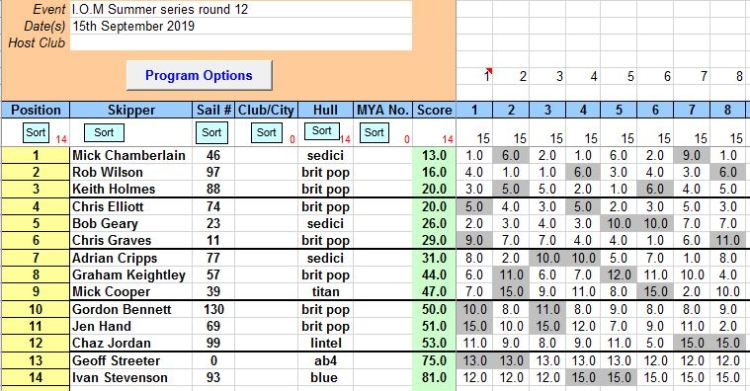 Another good day at Scotland farm, Record turnout with 14 skippers coming to the line and 6 different designs , Wind was 70 % of top suit to start and faded for the last three races, all very exciting racing along the East bank. We had a new Titan out from Mick Cooper for the first time, one or two minor issues as you always get with a new boat but trust me it will be quick. Mick Chamberlain got of to a good start with his Sedici just pipping Bob Geary with another Sedici, Normal service was resumed in race two with Robs Brit Pop just pipping Adrians Sedici , Race team Jen Hand kept things going and race three was Robs followed by Mick Ch. After race 4 a coffee break was called, the wind had dropped a little and in race 5 Keith Holmes got his name on the board with his Brit Pop, Chris Graves was struggling, maybe trying to hard , but had his just desserts in race 6 with a win. Ivan 93 had to leave early, and Geoff Streeter is still getting to grips with the AB4, Graham K was sailing very well, but as the breeze went soft it became more difficult to keep the boat moving, Adrian got a great win in race 7 and was so far in front it looked like he only did one lap ( Just Joking), Final win of the day was Mick Ch putting the Sedici on top of the pile for the day . The final series standings will be published in the next few days, and presentation of the trophy will be done at the clubs AGM early in November.