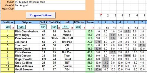 It was interesting that 11 different designs were sailed on the day and also interesting that some of our skippers have not yet come out to play , Bob G , Adrian C, Keith H, Rob W, and more . The fleet is strong and the racing second to none at the club. It was good to see Greg C 21 have a couple of good races and also Peter Cogill sailing a lot better. All in all, a good mornings racing and just a note,,,,, the summer series we race 10 am till 1pm and in the winter 10 am till 12 30 , many thanks to all for helping with the essentials. Sedici on top of the pile this week, boat was on fire , ( the twist in the mainsail was ” epic” !!!, but in two weeks it could well be a different story, There are in fact 4 Sedici’s at the club now be nice to see them all out one day, Before I go Pete Walters was lucky with the ” SCOTTO ” again !!!!! but like I always say ” you gotta be in it to win it “