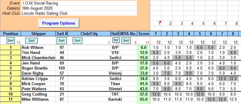 Another fantastic day of racing at Lincoln, wind around 40% of top rig North East breeze, a bit overcast but warm , had a great beat and run along the East bank. Eleven skippers turned out, just perfect for one fleet racing, and the first race was always going to be hard fought, and so it was with Rob W taking the first of 4 wins and gaining an unbeatable lead, Mick C and Tim H, chased and chased, others too were having great races, Roger B with his B/P got a second in race three, Jen Hand a second and two thirds in race’s 4/5/and 6 and a win in the last race of the day. Pete W was not at the races today and was unlucky some of the time, We all need to try and analize ( if we can remember ) where we went wrong, for me “Greed ” messed up two of my races when patience would have paid a dividend or two. A great mornings racing with a great bunch of lads , Many congrats to Rob W for the win and also to Tim who has not yet fully mastered the V10, but beware guys cos when he does he will be awesome. Many thanks to Roger B and everybody who helped out, and for those of you who missed it, I just hope ypu enjoyed the full English !!!!!!!