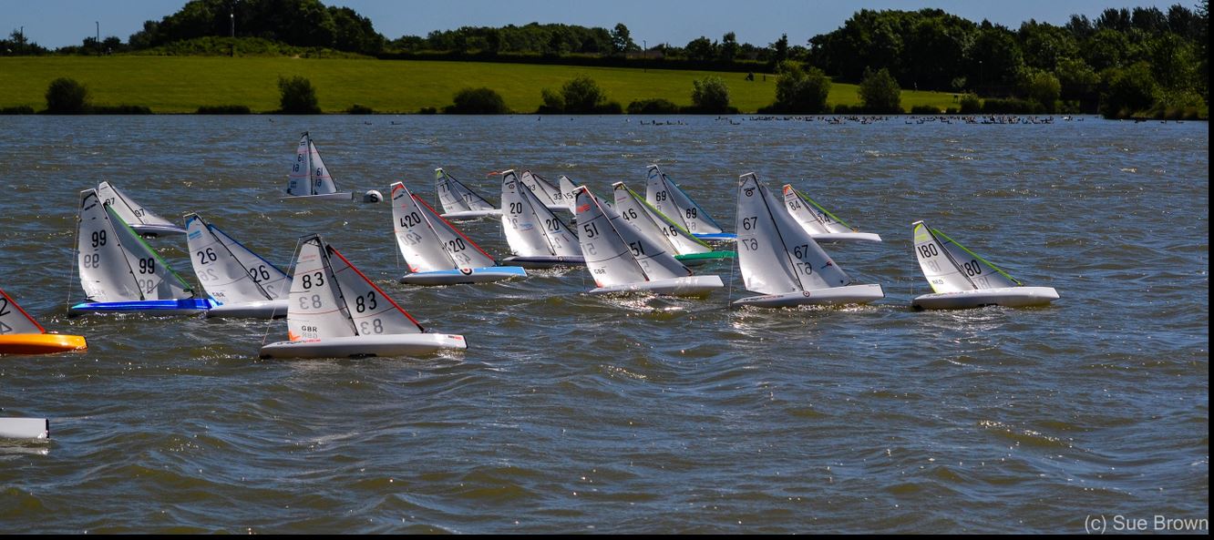 11 Skippers showed up on a fabulous Bank holiday Sunday morning, The sun was out and a good strong breeze was evident from the North. Mick Chamberlain set out in the dingy to check the bouys and move a few around, other members were busy doing bits and pieces with rakes , to enable Jen Hand the OOD to set a dog leg course up the East bank. Roger B had a breakage and missed the first two races, The breeze was about 90 % of A suit to start with and it gradually through the morning went went down to about 70%, which gave us all some fantastic racing.