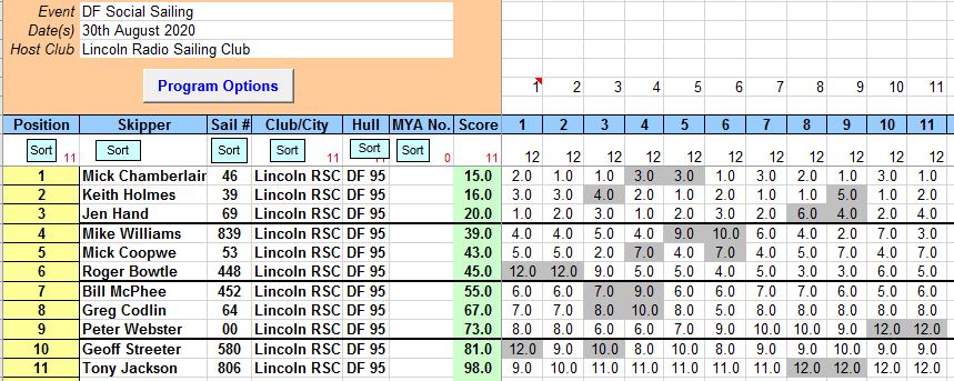Jen 69 got off to a great start and won the first race with Mick C 46and Keith Holmes 39 in close attendance, Mike W 839 getting to grips with the radio came home a creditable 4th. The next two races were won by Mick C 46 with the other Mick, 53 ( he thinks that is his age ) with the beeping tranny came home 2nd proving that the boat is certainly quick in the right direction. Many shifts up and down the course caught skippers out many times and made for some interesting racing, 11 races were completed by the 1pm deadline and we can only commend the OOD Jen , who kept things fluid and moving at a good pace. At this point I would like to point out that both Mick 53 and Mike 839 sailed probably as well as I have ever seen, Roger 448 had a couple of great 3rd’s in races 8 and 9 , and Jen 69 must have been well pleased with her performance. All in all a great mornings racing, and the only salad in attendance was in our sandwiches at coffee break, which we can only thank the Wednesday gang for all the hard work that has been put in over the last few weeks, Also many thanks to all the helpers before and after racing to get stuff organized and the skippers for making it such an enjoyable morning, Racing as you can see was close with Mick 46 just edging it.