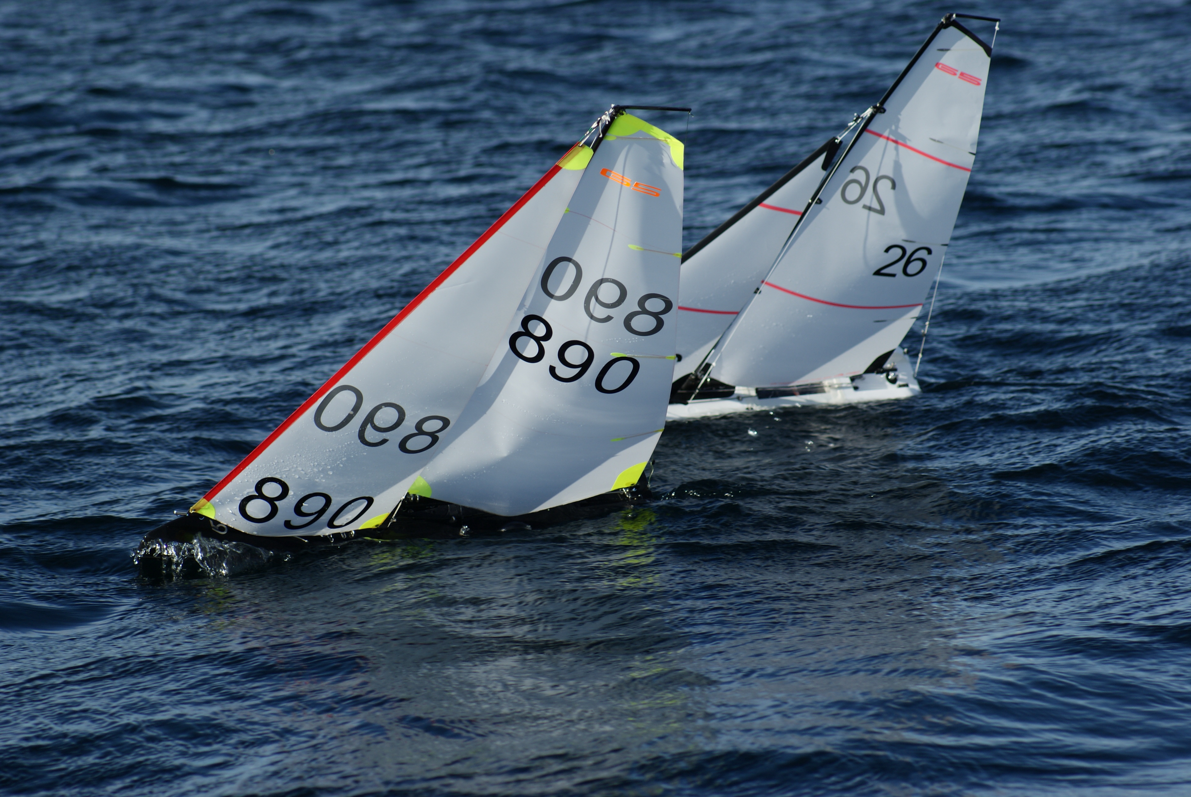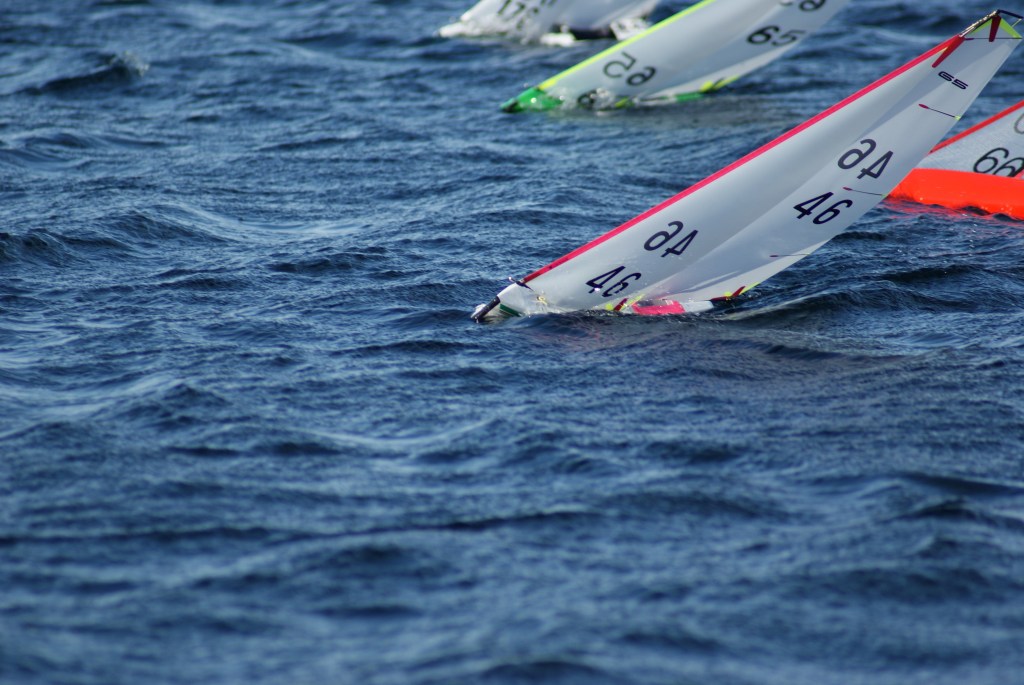 The shifts on the beat were ready to catch anybody out and so it happened on the third race with Mick Ch and Pete W and with only 20 feet from the line you would have put money on Mick Ch, one shift later Pete W took the win, and Jen Hafter sailing a great race took third spot. Race 5 / 5/ 6/ 7/ Mick Ch proved unstoppable with four straight wins, and in race 6 with the wind at max for A+ rig his elastic tensioner broke, and was hastily repaired with a knot and some super glue, at this time several skippers had decided to change down to A rig as this was definitely the prudent thing to do, Mick Ch however had used to much super glue and was unable to remove the sheet lines to change down.