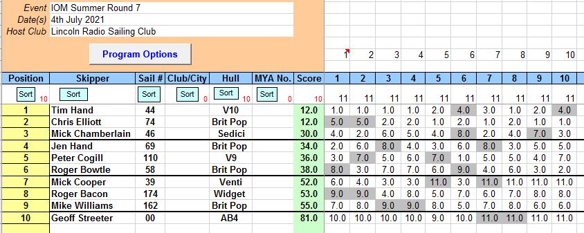 Great morning for racing, 10 skippers turned out, and for many reasons the fleet was depleted for this round, there was also a change of OOD’s assistant, which was Tim Cripps and just in case your thinking Mick C with the Sedici is back,, he shared the sailing of the Sedici 46 with Tim, who sailed very well , and apart from the starts sat on the bench, but both had a nice morning. Mick Cooper also suffering with major knee problems raced from the bench and had three good 3rd’s before retiring. The breeze was from the South west and backed into the South as the morning went on, Tim Hand 44 got off to a fantastic start wining the first 4 races before Chris E 74 clicked into gear and these two were well ahead of the fleet and the only race they did not win was won by Pete C 110 in race 6 The rain held off and despite being a bit fluky, racing was good and involved a bit of a dog leg course that worked well and kept skippers close to the bank.