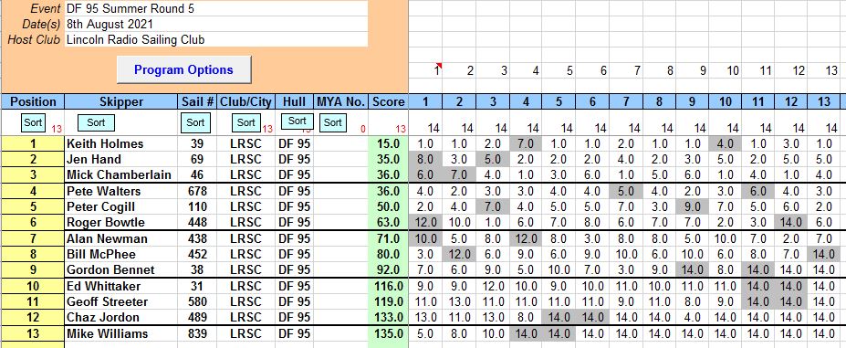 Around race 11 the heavens opended big style and skipper took shelter for 15 minutes in cars under trees and in the clubhouse to let it all blow over, which it did, and the sun came out and the breeze went somewhere else to play, and left us with about 7 knots from the south west, many skippers decided enough was enough and retired gracefully.