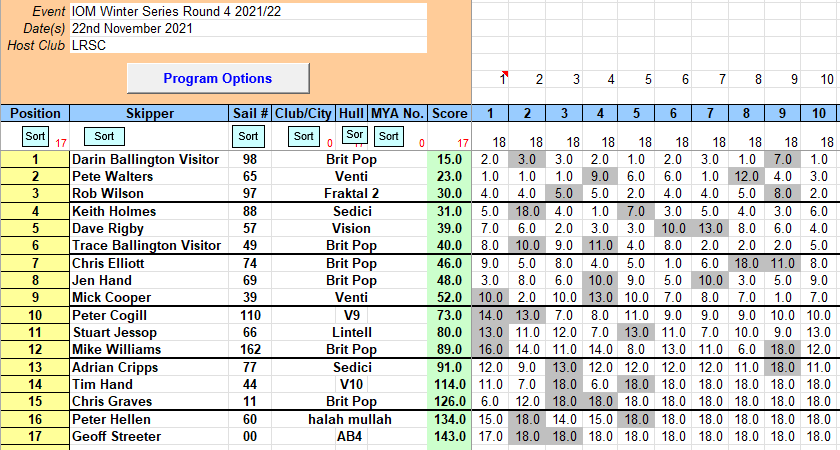 10 different designs on show here and as you can see, 4 skippers called it a day after the 4th race leaving 13 battling it out to the bitter end,. Very much improved was Mick C 39 or cooperman for short his level of concentration much improved, Just need to try and get a bit of consistency now and looking at the results only 6 points adrift of your mentor Chris E 74, you are getting there.