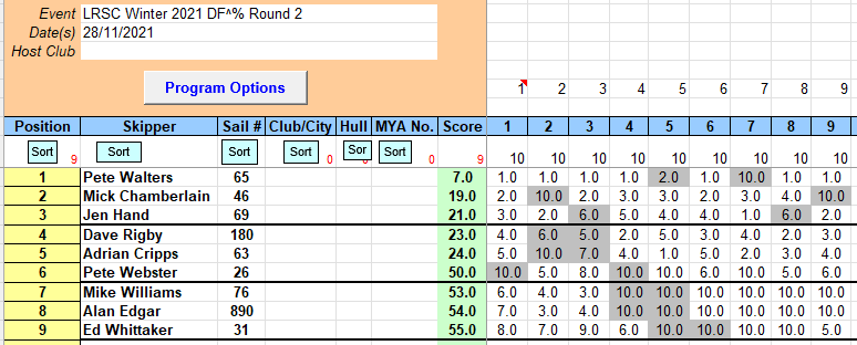 Cold , yes it was a bit cold, windy, no not really, sunny yes it was, In fact it was perfect conditions and with A+ rigs set all round , the 9 skippers had some great racing, unfortunately nobody could give Pete W 65 the competition on the day and he ended up with 7 bullets from 9 races Jen H 69 and Adrian C 63 were the only other winners in races 5 and 7. Mick C 46 had a breakage in race 2 that was quickly fixed, but on the day he was no match for Pete. Mike W 76 was also headed home early with a rudder servo failure as was Alan Edgar. The temperature never got above 1 degree but in the sun and with the walking it did not seem to bad.