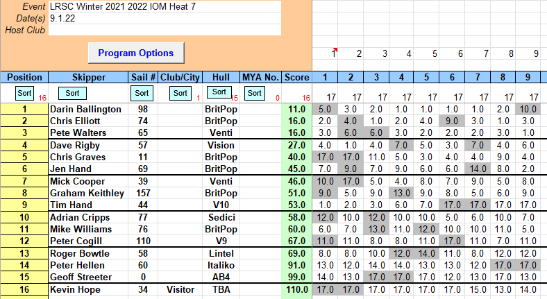 As you can see Darin won with I am sure a fight Chris E 74 got second on Countback from Pete W 65 Dave Rigby 57 continues to improve and Chris Graves 11 despite missing the first two races and using his discards managed to hold onto 5th place. It was with great regret that I missed the racing but congratulations to all skippers who took part, and many congratulations to Darin for his win both on and off the water