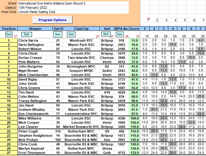 I was getting a bit cold and wet at this stage so handed the heat boat reigns over to Jackie and said my goodbyes to everyone and set out for home. Looking at the scoresheet the PRO managed to get 7 races completed in the allotted time, which was good going, and so on behalf of the skippers I would like to say thank you to all the members of Lincoln RSC for hosting the event, and I very much hope that you have dried off and had a few minutes to put your feet up. There was a lot of walking for everyone today. Gordon Sears Webmaster Midlands