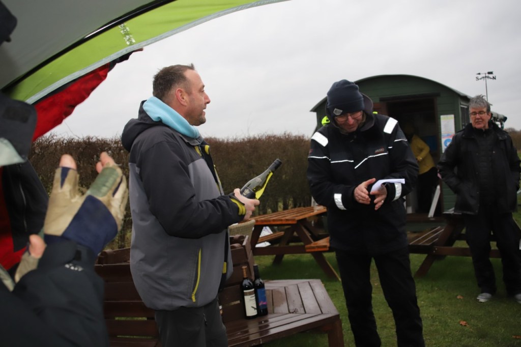 Dave Geldard called a lunch break at 12:20 after race 4B saying that we would recommence at 12:50. The skippers then topped up their cups and collected their Lincolnshire sausage burgers, and a few of us sat on the chairs provided under the gazebo to eat whilst we started to see the rain make an appearance.