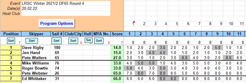 Seven brave skippers were greeted with rain and plenty of wind for round 4 of the DF 65 winter series.