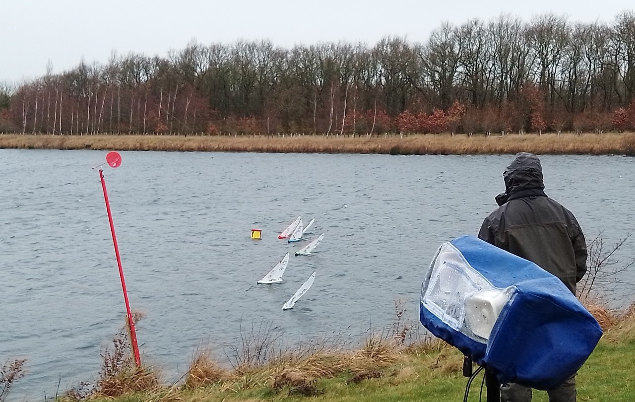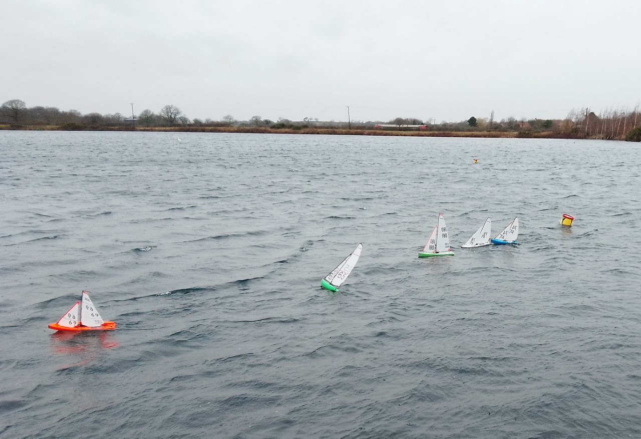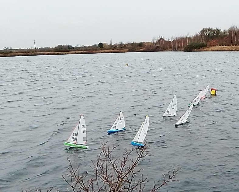 The forecast suggested a C rig day, however on arrival Roger 74 was sporting the C but a B seemed to be to be the more likely rig as the gusts were Infrequent and you either had the luck or not to be caught downwind. The B rigs led the first few races with Jen, Dave and Pete swopping places as getting tacks in at times was a challenge and you could be parked for some time if you got it wrong. We were racing the East Bank with a long beat and run followed by a half beat to the finish, races took about 14 to 15 minutes with Adrian keeping the races running. After coffee Pete W tried the C rig, first time on and incorrectly rigged, outcome , DNF. Jen was putting some bullets together with Dave coming in close with some very close finishing, Pete W went back to a B rig however water had got in into the boat somehow and after a good pint of emptying the receiver had failed, waterlogged end of racing for him. Jen and Dave shared the last few race bullets with Dave securing the overall. A challenging day with a strong breeze a constant fine drizzle but racing competitive as normal. Thanks to Adrian and Roger for sorting the racing. The car horn finishing gun was a nice touch, whether that was just to keep Adrian dry!!. From Pete Walters 65