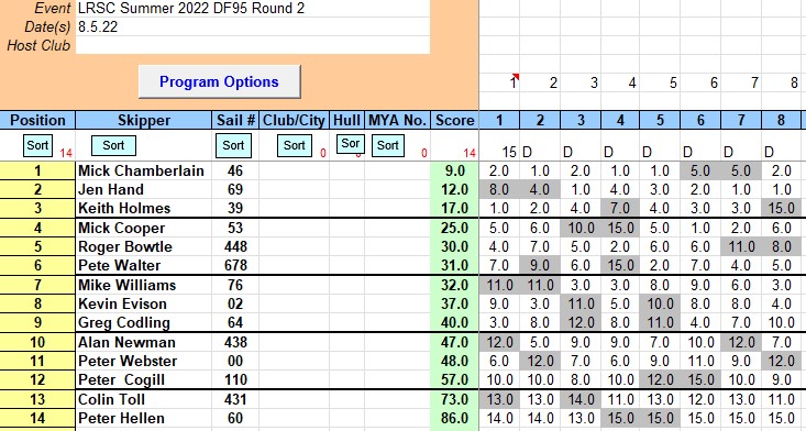 Great weather for round two with 14 skippers starting out, battery problems took Peter H 60 out after 3 races, disappointing, Peter we can help just ask. A suits all round in the light South Easterly and Jen as OOD got plenty of help with the buoys and stuff were sorted as she set the stage for some great racing. Keith H 39 was once again off the mark with the first bullet, with Mick C 46, 2nd and Greg C 64 sailing out of his skin getting a well deserved 3 Place. The light South Easterly was very fluky and the beat was not easy, catching out the unwary, only too often.