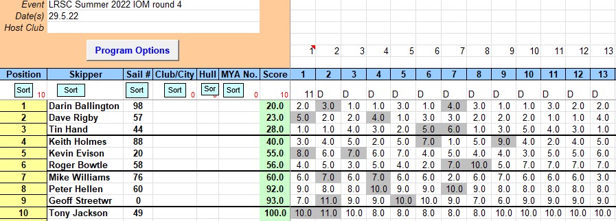 A smaller than usual, but still enthusiastic and competitive fleet, lined up for the latest round of the LRSC Summer IOM series on Sunday May 29th. A northerly breeze coming diagonally across the lake at Scotland Farm, causes difficulty for any RO and skippers, and Darin B was the RO struggling on this day. He managed to set a series of courses that whilst not as long as usual produced close racing with various skippers taking a win, a good start helped but was not essential as the shifty breeze did allow overtaking and most skippers experienced the joys of the ladders, but also the pain of the snakes, even those normally at the front were not immune from these. Racing started at 10.00am prompt and despite a few course changes a full set of 12 races was completed just before 1.00pm, in fact skippers were enjoying themselves so much that an additional 13th race was enthusiastically sailed before the morning’s racing was drawn to a conclusion.