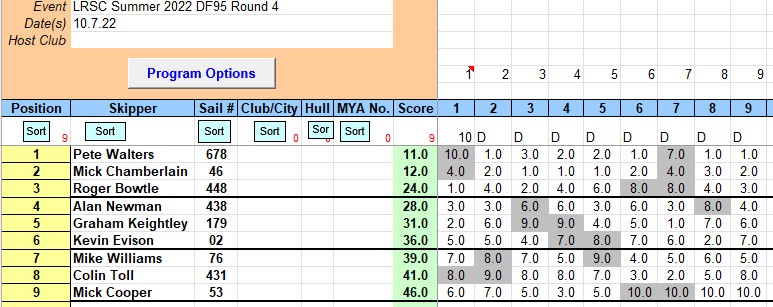 Gonna be a sun cream morning , and so it was, 9 skippers showed up to be greeted with a light Breeze from the North West ,,, mainly , Ed quickly set a course up on the South bank and we were ready to go, For some reason Pete W was not ready to go for race one and got sorted from race two. Roger B 448 won the first race in convincing style with Graham K 79 taking second spot , and Alan N 438 taking third, it was a good start line but made tricky because at the last minute or few seconds the wind would shift 20 degrees, so the ideal place to loiter was around the middle of the start line, Pete W now sorted and took the next bullet, closely followed by Mick C 46, and Alan N 438 keeping up his consistency with another third place, The next three races were Mick C 46 taking the bullets and looking unstoppable, when you have light winds the twist and set up are critical, as well as spotting any dark shadows on the water and getting there as quick as possible Kevin, Mike and Colin were sailing well and so was mick C 53 who has been missing for a few weeks, who indecently had to leave early due to family commitments. at the end of the Morning Pete W 678finished off with two Bullets and sealed the win, from Mick C 46 Proving yet again he is the man to beat at the farm in recent weeks, Sailing was done in great spirit with 9 races completed in the morning , Many thanks to all the helpers especially Roger B 448 who was there at the crack of dawn to get things ready for the race team,