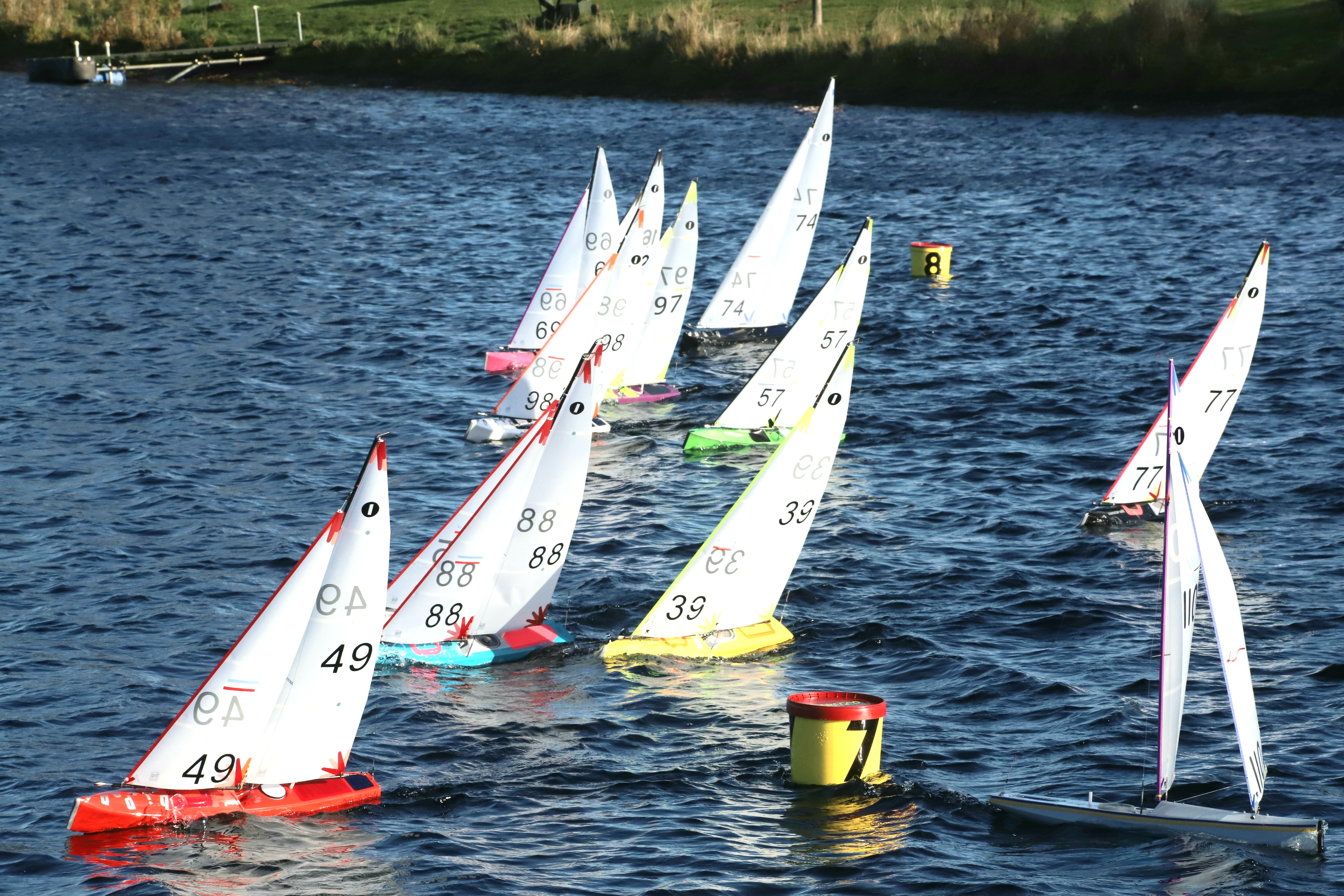 Roger B and Chris G set up a great course on the South bank, that was a lovely mixture of dried grass ( no rain for weeks ) and Canadian geese shit, which for the most part had dried out thank goodness, Still a few missing, from the regulars, 3 regulars went of to Manor Park to get some practice in for the upcoming DF 95 Nationals in two weeks time at Milton Keynes , Darin turned up with the family after having a pleasant day out round Newark. But on to the racing and 1st race bullet was Mick C 46 , At the top end of the beat it was quite fluky all morning and this was where you could go from hero to ( yes you guessed it ) in just a few seconds, Kevin E 02 was having a good time with his light airs flyer the Pikanto, and I am sure this boat in his hands will get better and better. It is certainly a bit of an art, sailing in light weather, and needs a fair bit of practice and sometimes quite a bit of luck, the racing was tight throughout the fleet and everybody had a battle on their hands, Mick C 46 seemed to just have the edge downwind with his top secret downwind setup, and Pete W 65 was very strong on upwind shifts, at the end of the morning it was a right royal battle with the two Venti’s with Pete W 65 just taking the top spot on countback. Rob W 97 took third spot and Dave R 57 got fourth spot.