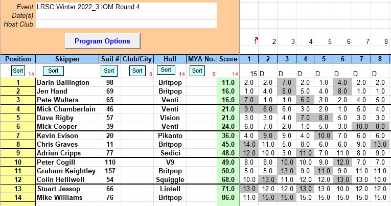 Dave R 57 has things on his mind at the mo but don’t worry he will be putting in some good performances in 2023 , and Mick C 46 only got him on countback by winning race 6 . Kevin’s Pikanto is getting quicker. All in all a decent day’s racing, With Darin getting the win, but definite highlight of the day was Jen H 69 winning three races ( more than anyone ) and taking second spot on Countback from Pete W 65, It felt that we are getting closer to Darin B 98 , but his consistency nailed it yet again. Round 5 is next year and I am sure we will all be ready. Well done all skippers and especially to Darin for his win.