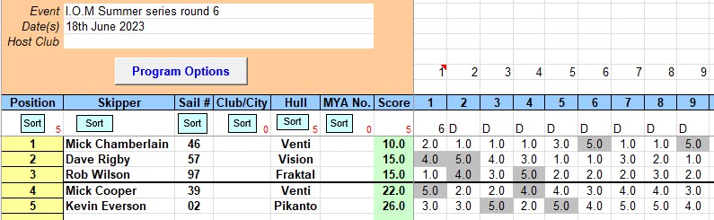 “Fathers day”, and so the only skippers who turned up were those that had no lunch invitation from there kids , Simples , But for those that came we had quality racing, forecast was for rain all day , but we are not sure where cos it was not at Scotland farm. Just a short report cos I am not used to doing it, but the light breeze was straight down the East bank With two long beat and runs and a shorter beat to the finish, we all rocked up early got it all sorted and raced , Mick C 46 got some great practice with Rob W 97 ready for next weeks ranking up on the moors in Yorkshire, Rob was sailing his Fraktal and so there was not a Brit Pop in site, Dave R 57 beat Rob on countback , and did the majority of the start line work, All in all a great mornings racing with a great bunch of guys, always enough wind but it was a bit fluky, and could catch you out, that is if you weren’t over the line at the start.