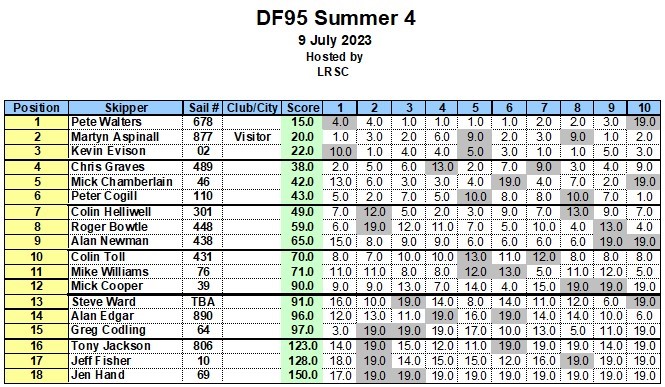 Great day , a little on the light side breeze wise , but filled in as the morning progressed, Gravesy was OOD and Jen his assistant, all worked well, for the 18 skippers who showed up for this very popular class. Ok someone came with the wrong boat , but that worked well as we had a few visitors, Including one lady and her grandson who traveled all the way from Sleaford , and by the way the little lad had great fun with the spare DF 65, sorry I did not catch names.. We had one visitor from Rotherham who was racing, and he may well become a member in the near future, Martyn A 877 and he showed the locals, most of them the way round claiming a second place with a fine performance.