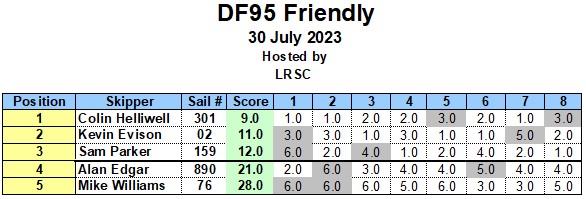 With a rare gap in the club calendar, five DF95 skippers got together at the lake on Sunday for some informal racing. (A thanks to Mike W for taking the lead on co-ordinating it).
