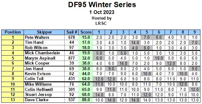 Fourteen skippers turned out for the first round of the DF95 winter series, unfortunately one skipper had to return home before racing commenced to deal with domestic issues….we all wish Alan Newman and his family well, ( mick has since heard that Alans wife had a fall but she is OK )