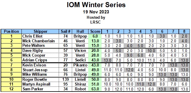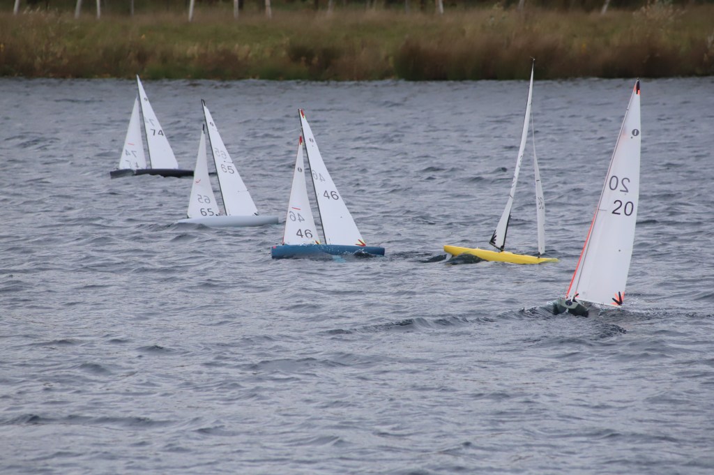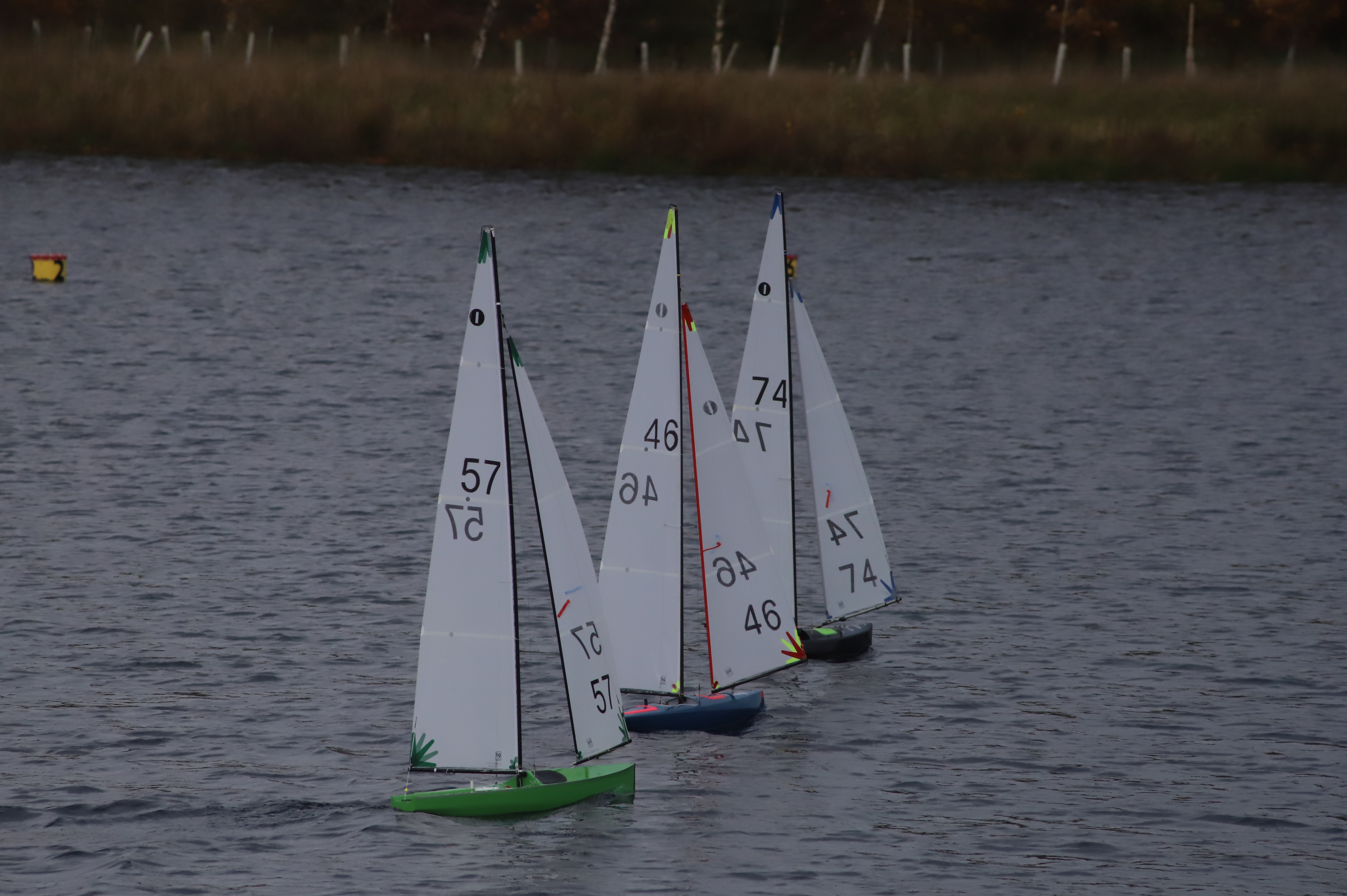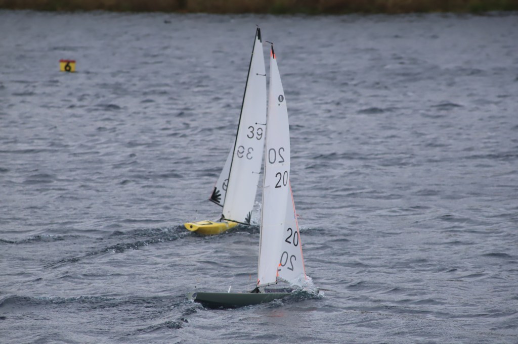 As you can see from the score sheet Chris E 74 with two T’s was not in a sharing mood today , winning 6 of the the 8 races , in fine style I may add, the racing was a lot closer than it looked, and once again consistency was key, if you look at the top four places, it was a good three beats and 2 runs course, and a variety of designs were on the water, including 2 Lintels that go way back , Martyn A 95 had a desperate day and cant wait to get his hands on his next boat which I am sure will propel him much closer to the sharp end of the fleet, Dave R 57 was having a good day as was Cooper man with his Venti and a torn jib that was hastily repaired, Nice to see Adrian C 77 back after a bit of an absence, Kevin E 20 was also doing well , and I hear his new boat has been moulded deep down Valencia way. Towards the end the breeze built and invariably we had one or two casualty’s, and in the final race we were down to 6 skippers.