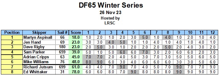 The majority of wins were shared between Jen and Martyn with 5 each. Dave and Sam scored a bullet each. Dave caused much amusement by his attempt to set a record for how many times a skipper could be over the line at the start. He was cheered on as he managed 5 or 6 and had no competition on that aspect of the day. He did recover his race position admirably each time though and tied with Jen for second place with 23 points, only losing out on countback. Martyn took the day with 18 points.