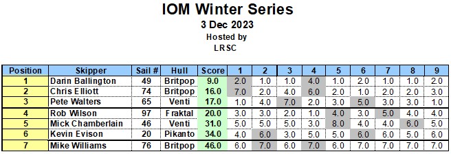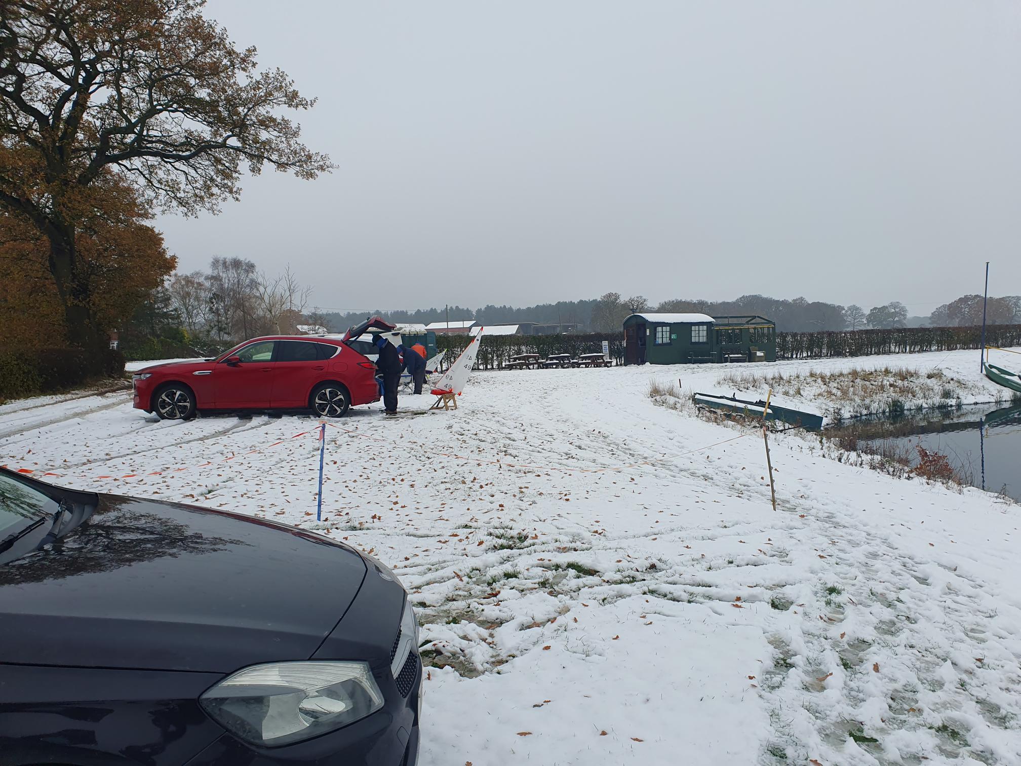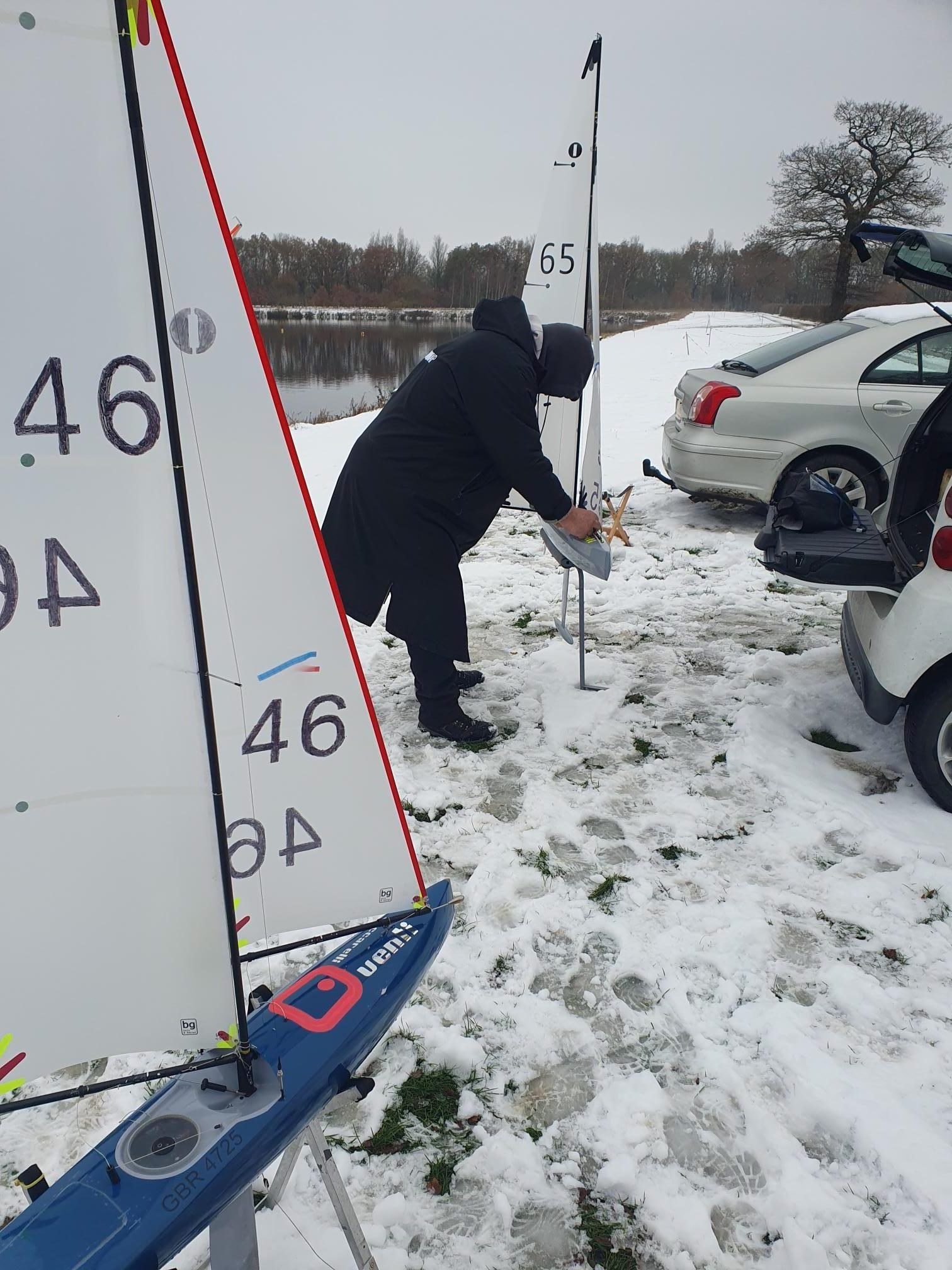 Wow , Chilly it could well have been, the temperature that greeted the seven skippers, some of whom had travelled a fair distance I may add was 1 degree above Zero, Most houses and areas had a fair dusting of snow some say 4 inches, some did not brag about it, but the gritters had been to most places, and the roads if you were careful were ok . Rob Wilson the OOD got there early, and we all decided to leave the dingy where it was and use the marks available to us , worked out well as it happened, the breeze once it was found was in the South east, much more of a whisper , and racing started and finished on the South Bank, “sounds exotic doesn’t it ” It was not,, but the trampling feet soon had the snow bedded down, and racing begun, very light whisper of a breeze as I said before and Pete W sailing his Venti made light work of race one, securing the over Darin ,, race two and in fact race 3 Darin 49 got the bullets, and race 4 Rob W 97 took a win, generally the racing was tight, and with no wind chill , all skippers stayed warm as far as I know, it was great to have such a good turnout in very adverse conditions, and we know that some skippers were just unable to get to the lake due to the conditions , but you all have one more chance 17th December will be round five of this series and I am expecting it could well be a mince pie day , However back to the present , 9 races completed Darin with 5 wins Pete with a brace and Chris E 74 and Rob W 97 one a piece, some skippers found it very tricky to get to grips but hey as always, as we know cream rises, so very well done to Darin who by the way travelled a fair old distance to race , enjoyed by all a morning of fresh air and one again good racing. in fact a pleasure to be out .