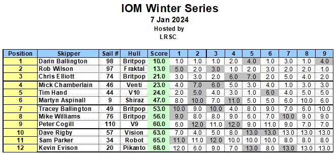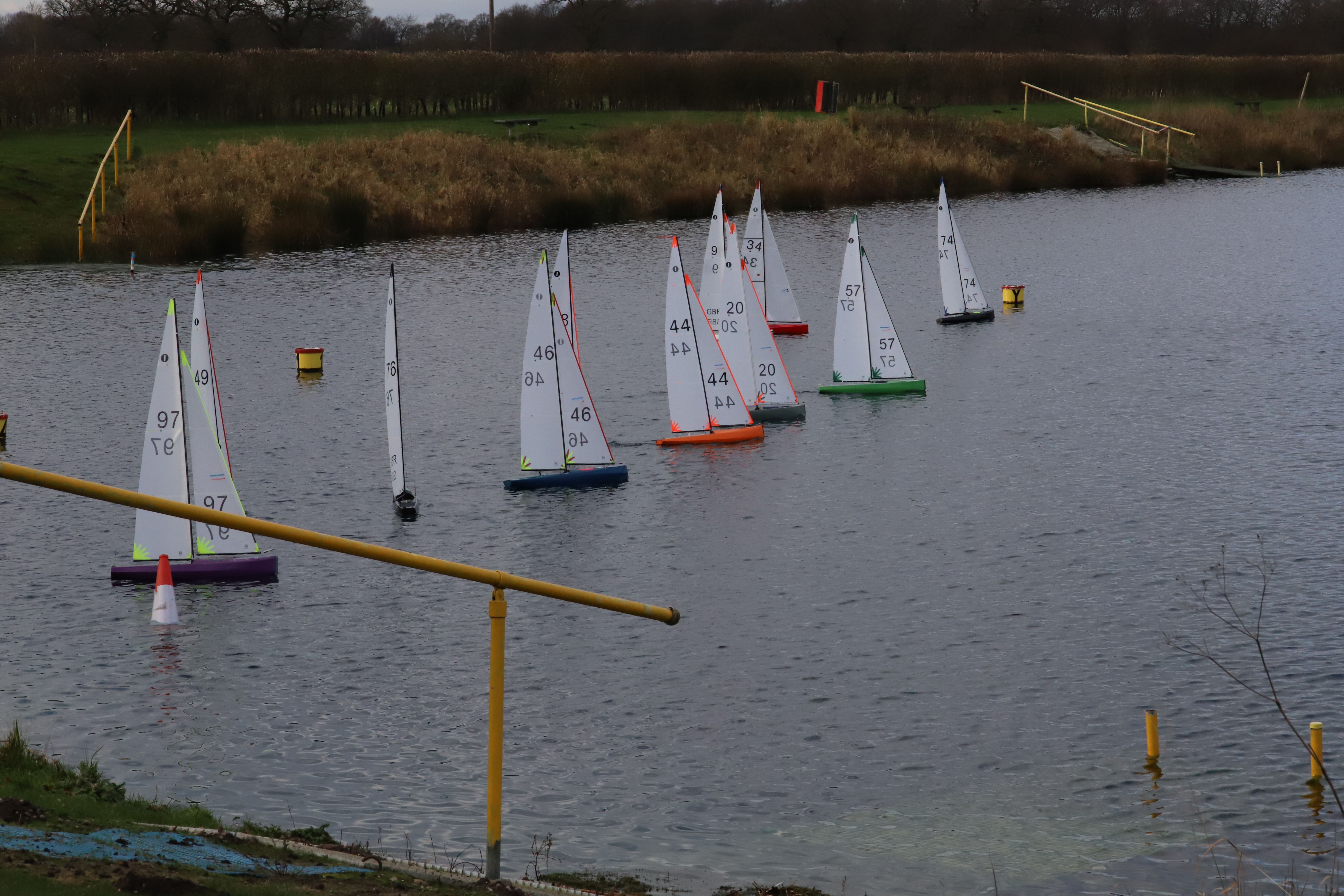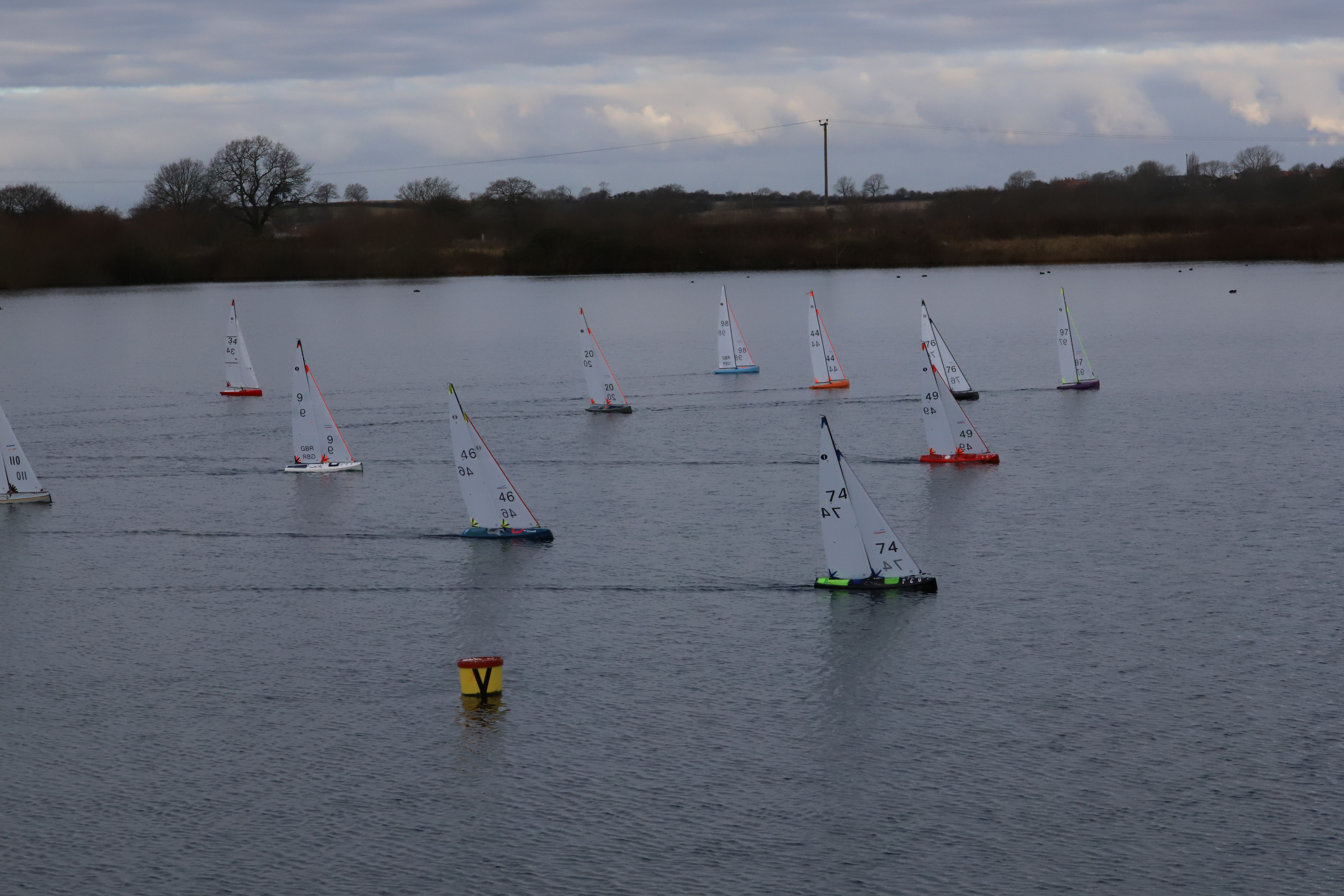 At last a break from the constant rain, but with a good, but light air forecast 12 skippers showed for what turned out some great racing, Micky boy and Kevin were down early to get things sorted, only 8 buoys left serviceable after the recent gales, but it was enough, racing was on the East bank, a slightly awkward direction making the weather mark a slight eyesight test for the old uns , but hey , a new Brit Pop was on show today with new sails, and it flew, wining the first three on the bounce, other skippers not really getting a look in, Rob W 97 sailing his Brit Pop ( don’t be fooled by the score sheet Fraktal it was not ) and he was well worth his second spot overall, racing was tight up and down the fleet especially the early races where the breeze coming out of the North was there to deceive the unwary. Chis E 74 took overall third spot. After the coffee break the breeze increased a couple of knots, and a gate was installed on the end of the downwind leg, it was all still very fluky, as is usual, but the young guns took the top three spaces, all with Brit Pops and so very well done to them, banter on the bank was great, and sailing/ racing was despite being very competitive carried out with respect for fellow skippers. Well done to Darin B for his win and to all who raced today .
