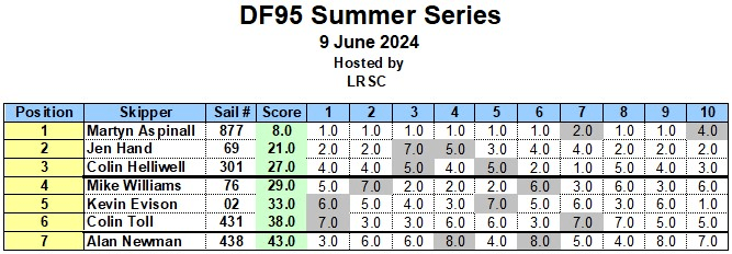 The tricky wind changes and some weed issues played their part in positional changes during the racing, but after 10 completed races, Martyn won the day with 8 points , Jen came second with 21 and Colin third with 27.