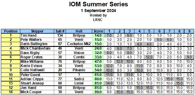 14 skippers showed up to enjoy the penultimate round of the IOM Summer series including a visitor who we hope will become a permanent club member, ‘Peter Guest’. Welcome to Lincoln Radio Sailing Club, the home of hot competition.