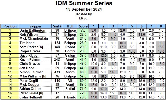 So well done to Darin and we also would like to say good luck for out two members Rob and Tim who are off to the I.O M Worlds in Australia next month it is I am sure a great honour to be able to represent you club ,, Our club in this great event , Many thanks to all Skipper’s and we look forward to seeing you all back for the Winter series.