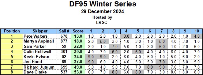 The last race of 2024 closed with an excellent morning of sun, sailing and seasonal greetings. I arrived early to find Colin was desperate to get onto Santa’s good list for next year as he had arrived early and most of the Prep was done. Shortly after our very own Santa arrived disguised as Pete, no reindeer they were resting. He jumped in the boat and set a course down the east bank with a steady breeze although a little shifty at times. A rig was the order of the day. By 0915 a course was set and our numbers had grown enough to run a pantomime. This year it was Snow White (played by Jen) and the 7 dwarfs some of us not so little.