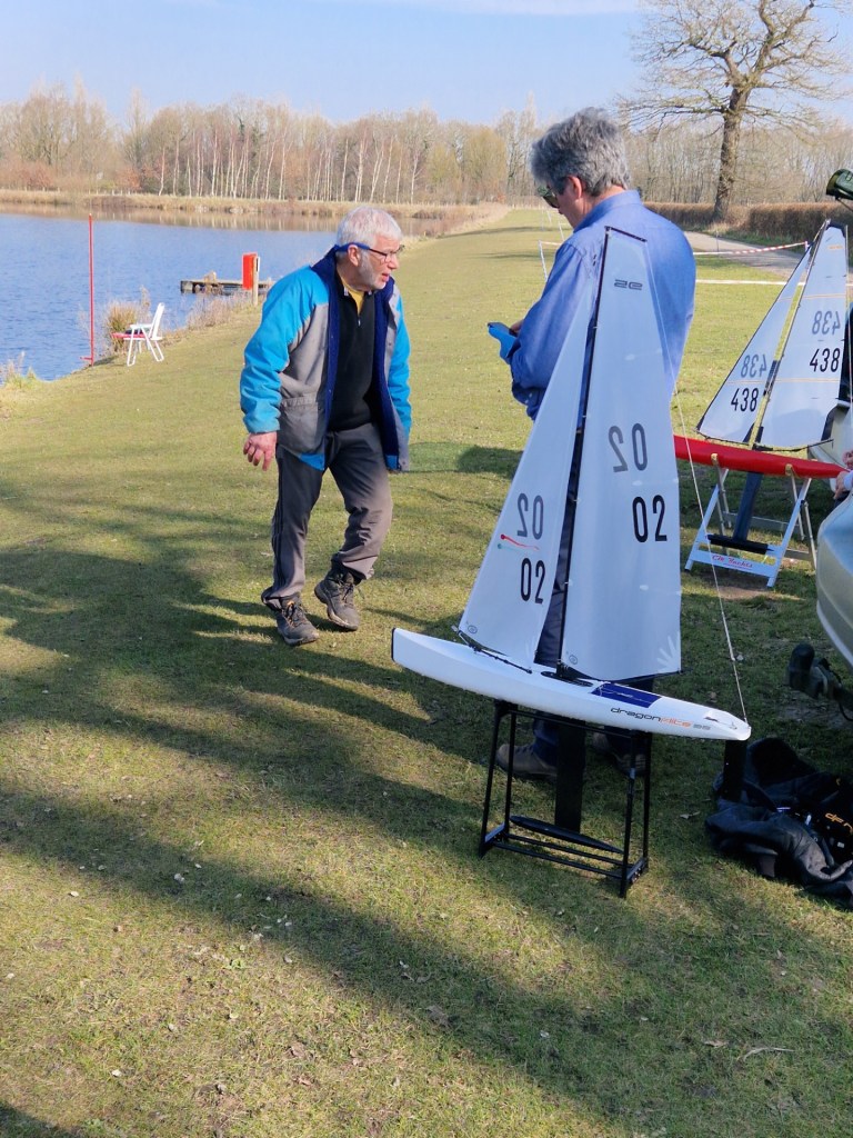 It looked like a beautiful day, just a small factor , where was the breeze, Patient’s I hear the call , and so it was , Roger the OOD had got there early and with the absence of his assistant got everything ready for racing , which bank ??? eventually a light flutter of a breeze filled in from the North east and we were racing along the East bank, Tim H had jumped in the dingy and sorted a great course, the 9 skippers looking happy and radiant in the sunshine, the lake looked fantastic as last week the dye was put in, and wow did it look blue, Pete was away quick as ever and took the bullet in the first race With Mick and Tim taking 2nd and 3rd , Colin H who needed this round, was 4th and sailed well, a tad more aggression on the start line, mate, races two and three it looked like becoming the Pete and Time event as both were giving it all , Kevon E got a great 2nd in race two, Micky boy was keeping in touch with the leaders, and with the breeze giving us a few extra knots it was looking a lot better even though the breeze was veering and it eventually swung far enough for us to change banks after race 5 which Tim won. Paul K was putting in some good results while Alan N 438 was suffering leccy or range problems, Colin T was soldiering on as was Roger, But the top three were sailing very well and any chance of crumbs fell by the wayside as Micky boy won the next two races all on the South bank, Pete took race 8 and Tim race 9 , it was going to be difficult to call a winner this morning, it was that tight , and it all came down to countback, The top three are on their way to the IOM ranking next weekend and I am sure will continue the tight racing .