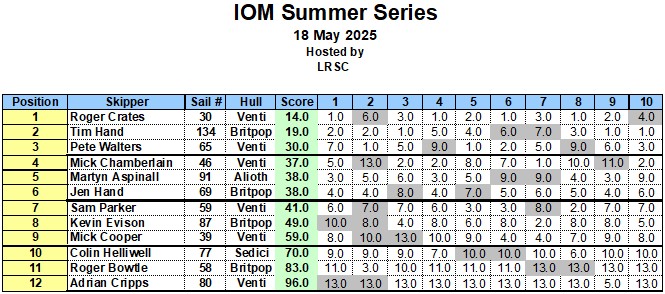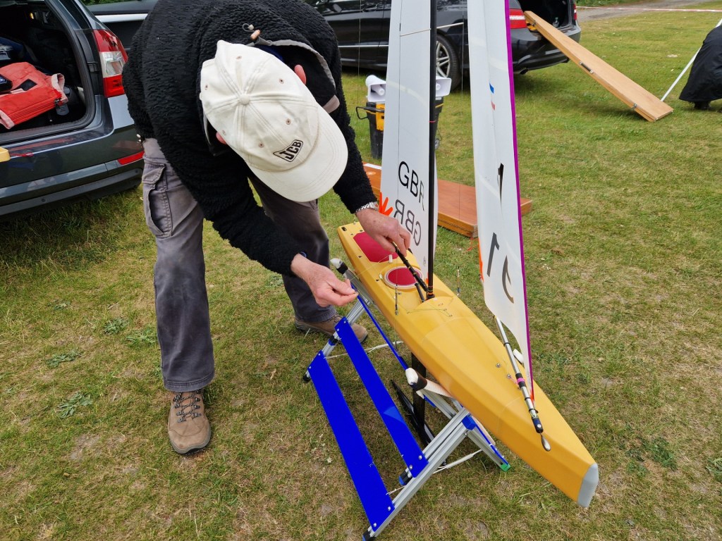 Tim the OOD and Roger B were at the lake early, and waited patiently for the breeze to settle, a course was set on the East bank and racing started early for the 12 skippers, a few missing, but we were ready to go, Some big holes in the beat made this a bit tricky but not for Roger C 30 who simple romped away. Tim H 134 got a good second and Martyn A 91 with his new Alioth got third spot and showed good speed for the first time at the club. Pete W , 65 with another brand new Venti took control in the second race and just held off Tim H 134 to secure the win Roger B 58 took third spot with his Britpop. The tea break was called early due to one of the boats having fixable winch line problems, Race three and Tim got the win with Micky boy C 46 getting the first of his two second spots, unfortunately his brain was in the wrong gear resulting in a lack of consistency during the morning, I have to say conditions were tricky, but having said that Roger C 30 made it all look too easy with yet another of his four wins on the day, Tim notched up three wins , Pete two wins, and Micky Boy one win, Battles all thru the fleet great to watch, racing was close and conditions tricky, we lost Adrian C 80 early on with winch problems but I am sure most went home happy, and will be looking thru the results to see maybe where they could have done a touch better. Well done to Roger Crates for the win , and thanks to all for helping put all the gear away.