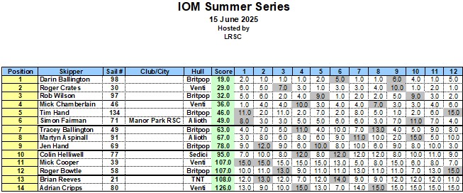 Darin B has found his IOM form again and went on to win the next 3 races, winning a total of 6 out for the twelve races sailed and taking the days series overall with 19 points. In a distant second place was Roger Crates with 3 wins and a 29 point total, closely followed by Rob Wilson on 32.