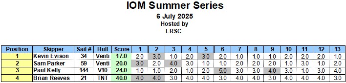 With the big boys and girls of LRSC off plying their skills at the Datchet Ranking event, round 6 of the IOM summer series was always going to be light on numbers. The forecasted rain throughout the morning maybe put a few off too. But 4 skippers sailed some competitive, fair sailing in good humour.